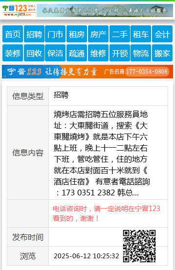 燒烤店需招聘五位服務員