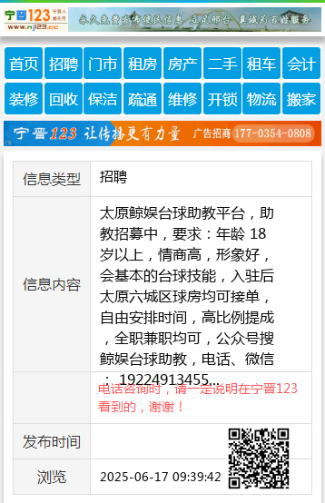 太原鲸娱台球助教平台,助教招募中,要求:年龄 18 岁以上,情商高,形象好,会基本的台球技能,入驻后太原六城区球房均可接单,自由安排时间,高比例提成,全职兼职均可,公众号搜鲸娱台球助教,电话、微信: 19224913455 【电话咨询时,请一定说明在太原生活网看到的,谢谢!】 |
