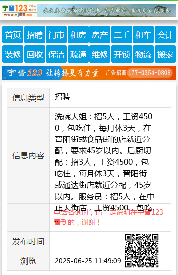 洗碗大姐:招5人,工资4500,包吃住,每月休3天,在晋阳街或食品街的店就近分配,要求45岁以内。