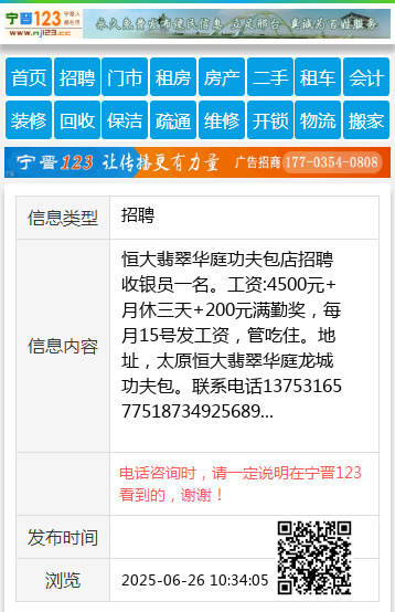 恒大翡翠华庭功夫包店招聘收银员一名。