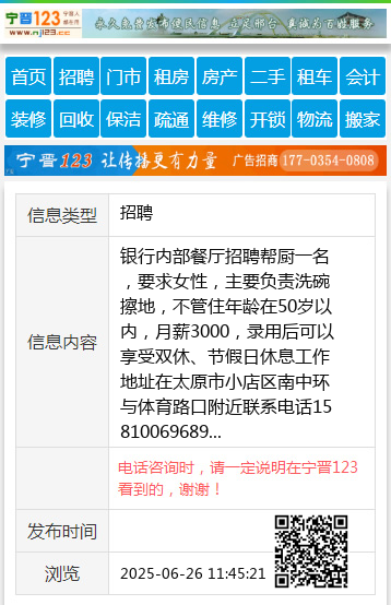 银行内部餐厅招聘帮厨一名,要求女性,主要负责洗碗擦地,不管住