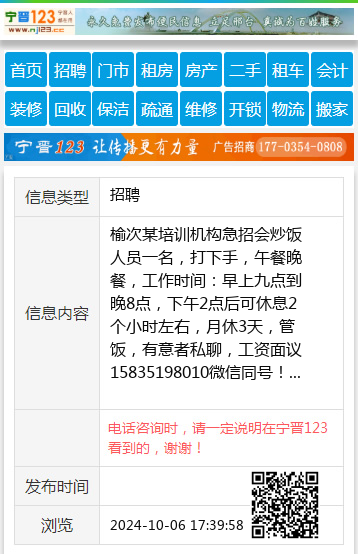 榆次某培训机构急招会炒饭人员一名,打下手,午餐晚餐,工作时间:早上九点到晚8点,下午2点后可休息2个小时左右,月休3天,管饭,有意者私聊,工资面议15835198010微信同号!