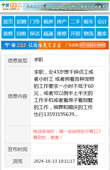 求职,女43岁想干钟点工或者小时工 或者照看各种宠物的工作要求一小时不低于60元,或者可以倒半上半天的工作手机或者看房子看别墅的工作,殡葬和婚庆的工作也行13593195639 【电话咨询时,请一定说明在太原生活网看到的,谢谢!】 |