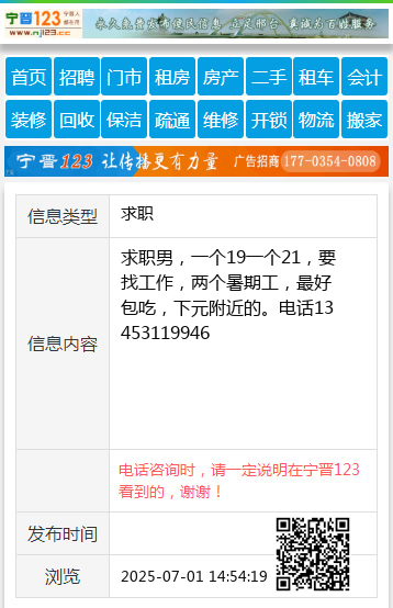 求职男,一个19一个21,要找工作,两个暑期工,最好包吃,下元附近的。电话13453119946 【电话咨询时,请一定说明在太原生活网看到的,谢谢!】 |