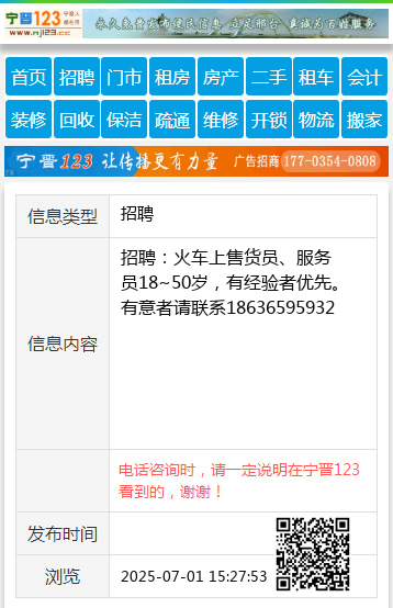招聘:火车上售货员、服务员18~50岁,有经验者优先。有意者请联系18636595932