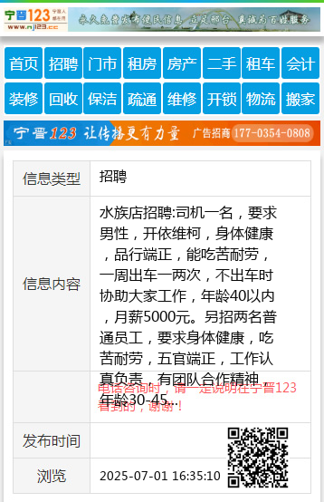 水族店招聘:司机一名,要求男性,开依维柯,身体健康,品行端正,能吃苦耐劳,一周出车一两次,不出车时协助大家工作,年龄40以内,月薪5000元。