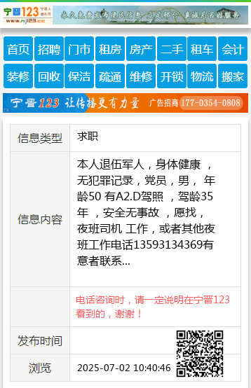 本人退伍军人,身体健康 ,无犯罪记录,党员,男, 年龄50 有A2.D驾照 ,驾龄35年 ,安全无事故 ,愿找,夜班司机 工作,或者其他夜班工作