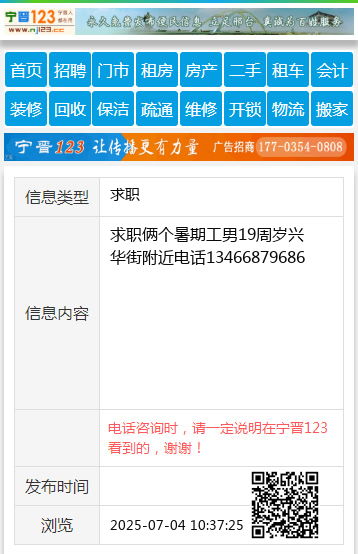 求职俩个暑期工男19周岁兴华街附近电话13466879686