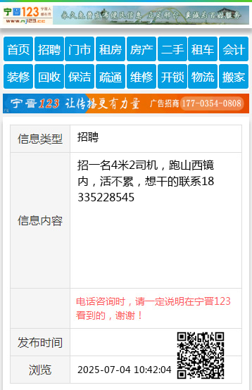 招一名4米2司机,跑山西镜内,活不累,想干的联系18335228545 【电话咨询时,请一定说明在太原生活网看到的,谢谢!】 |