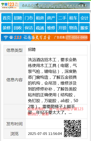 洗浴酒店招木工,要求会熟练使用木工工具(电锯,气泵气枪,锂电钻),深度熟悉门窗构造,了解五金锁具的机构,会吊顶,维修涉及到的修修补补,了解各类胶粘剂的正确使用(结构胶,免钉胶,万能胶,ab胶,502等)。需要爬梯子上脚手架,年纪不要太大了。需要会维修电子锁具。酒店家俱涉及到的各种油漆,掉皮的会修补。各种装饰线条松动或损坏的需要会修复。墙面壁纸,地毯等会粘接。