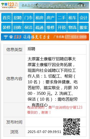 2. 洗碗工、保洁(10 名):需吃苦耐劳、有责任心,月薪 2500 - 3000 元。