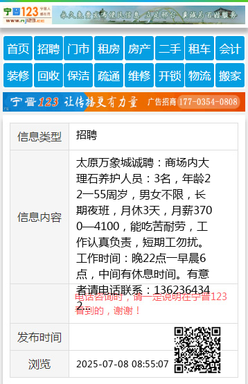太原万象城诚聘:商场内大理石养护人员:3名,年龄22一55周岁,男女不限,长期夜班,月休3天,月薪3700—4100,能吃苦耐劳,工作认真负责,短期工勿扰。工作时间:晚22点一早晨6点,中间有休息时间。有意者请电话联系:13623643423 郭经理 【电话咨询时,请一定说明在太原生活网看到的,谢谢!】 |