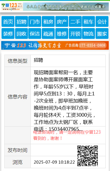 现招聘面案帮厨一名,主要是协助面案师傅开展面案工作,年龄55岁以下,早班时间早5点到13:30,每月上1-2次全班,即早班加晚班,晚班时间为4点半到7点半,每月轮休4天,工资3000元,工作地点为太钢厂区,联系电话:15034407965 【电话咨询时,请一定说明在太原生活网看到的,谢谢!】 |