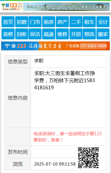 求职:大三男生求暑假工作挣学费,万柏林下元附近15834181619 【电话咨询时,请一定说明在太原生活网看到的,谢谢!】 |