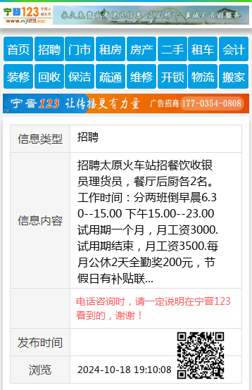 | 防骗提醒: | 太原生活网(www.sxtaiyuan.net)提醒您:手工活、网络兼职、刷单,都是骗子!凡以各种名义收取费用的都是骗子!找工作是往兜里挣钱,让你往外掏钱的都是骗子!异地招聘请提高警惕,谨防诈骗! |