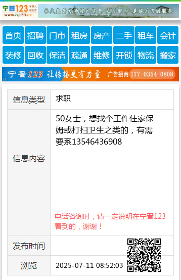 50女士,想找个工作住家保姆或打扫卫生之类的,有需要系13546436908