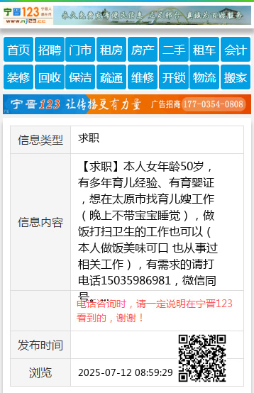 【求职】本人女年龄50岁,有多年育儿经验、有育婴证,想在太原市找育儿嫂工作(晚上不带宝宝睡觉),做饭打扫卫生的工作也可以(本人做饭美味可口 也从事过相关工作),有需求的请打电话15035986981,微信同号。 【电话咨询时,请一定说明在太原生活网看到的,谢谢!】 |