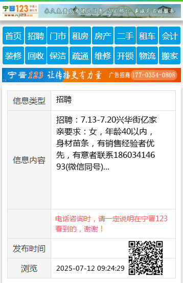 招聘:7.13-7.20兴华街亿家亲要求:女,年龄40以内,身材苗条,有销售经验者优先,有意者联系18603414693(微信同号) 【电话咨询时,请一定说明在太原生活网看到的,谢谢!】 |