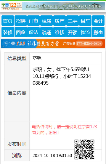 求职,女,找下午5.6到晚上10.11点都行,小时工15234088495