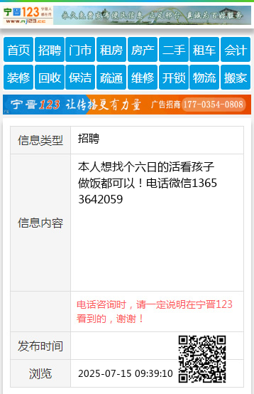 招聘住家 阿姨 地址:建设北路小东门附近 工作内容:独居老太太91岁,需要往扶助行器上扶一下110斤,自己能走能上厕所,独立房间不起夜,早上倒尿盆 工资:3500 每周休2天,必须休 杜老师:19510363484