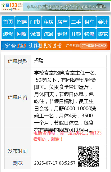 食堂主任一名: 50岁以下,有团餐管理经验即可。负责食堂管理运营,月休四天,节假日休息,包吃住,节假日福利,员工生日会等,月薪6000-10000
