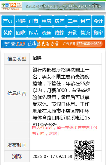 主要负责洗碗擦地,不管住,年龄在55岁以内,月薪3000,有洗碗经验优先录用,录用后可以享受双休、节假日休息。