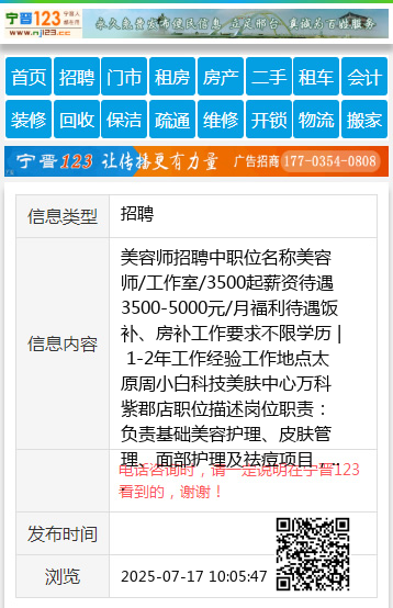 美容师招聘中职位名称美容师/工作室/3500起薪资待遇3500-5000元/月福利待遇饭补、房补工作要求不限学历 | 1-2年工作经验工作地点太原周小白科技美肤中心万科紫郡店职位描述岗位职责:负责基础美容护理、皮肤管理、面部护理及祛痘项目,操作常用美容仪器,服务顾客体验。职位要求:有1-2年美容相关经验,掌握基本手法,能熟练使用美容仪器,有初级美容师证优先,有销售经验更佳。工作时间:09:00-20:00,根据业务需求灵活安排。薪资福利:月薪3500-5000元,提供饭补、房补和免费工服。联系方 【电话咨询时,请一定说明在太原生活网看到的,谢谢!】 |