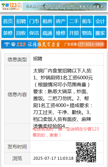 太钢厂内食堂招聘以下人员: