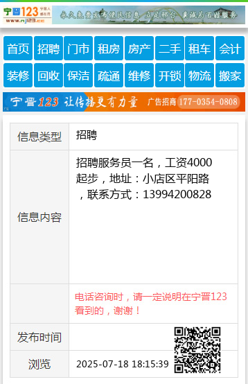 招聘服务员一名,工资4000起步,地址:小店区平阳路,联系方式:13994200828
