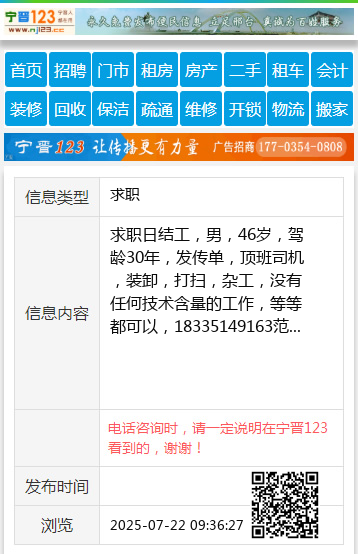求职日结工,男,46岁,驾龄30年,发传单,顶班司机,装卸,打扫,杂工,没有任何技术含量的工作,等等都可以,18335149163范 【电话咨询时,请一定说明在太原生活网看到的,谢谢!】 |
