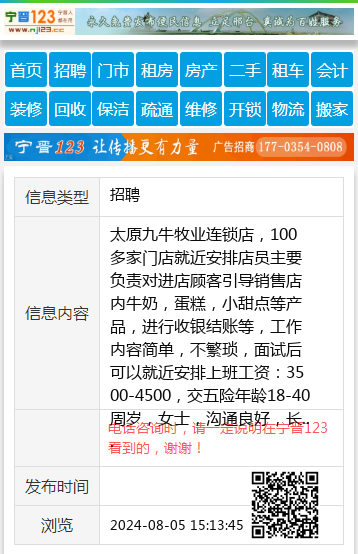 太原九牛牧业连锁店,100多家门店就近安排 店员主要负责对进店顾客引导销售店内牛奶,蛋糕,小甜点等产品, 进行收银结账等,工作内容简单,不繁琐,面试后可以就近安排上班 工资:3500-4500,交五险 年龄18-40周岁,女士,沟通良好,长期稳定 13663513827
