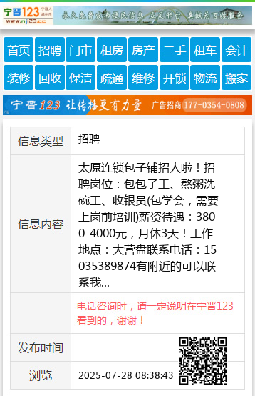 招聘岗位:包包子工、熬粥洗碗工、收银员(包学会,需要上岗前培训)