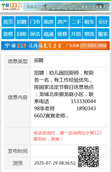 招聘:幼儿园招厨师,帮厨各一名,有工作经验优先,按国家法定节假日休息 地点:龙城北街御龙庭小区, 联系电话 15333004498李老师 18903436602宣宣老师