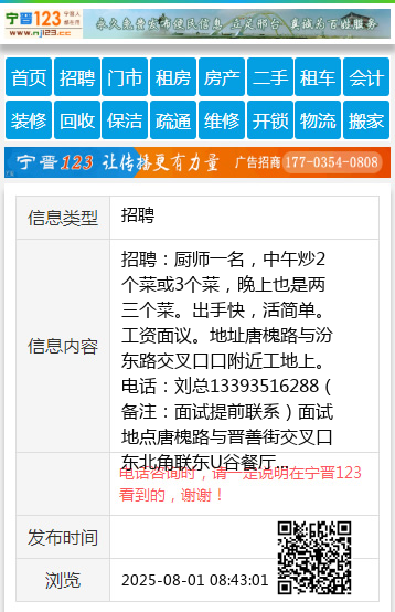 招聘:厨师一名,中午炒2个菜或3个菜,晚上也是两三个菜。