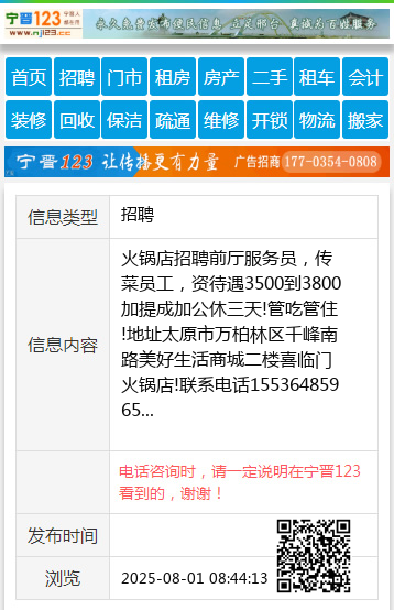 火锅店招聘前厅服务员,传菜员工,资待遇3500到3800加提成加公休三天!管吃管住!地址太原市万柏林区千峰南路美好生活商城二楼喜临门火锅店!联系电话15536485965 【电话咨询时,请一定说明在太原生活网看到的,谢谢!】 |