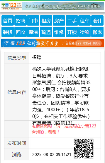 榆次大学城漫乐城锦上超级日料招聘: 前厅:3人.要求形象气质佳 会拍视频剪辑3500+; 后厨:各岗8人,要求身体健康,热爱餐饮行业 有责任心、团队精神,学习能力强、4000+;(年龄18-50岁,有相关工作经验优先) 有意者请加微信13111271111沟通、最近工作忙不接电话谢谢!