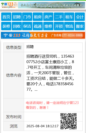 招聘酒行送货司机,13546307752小店富士康招小工,8.7号开工,车间清除垃圾的活,一天200不管饭,管住,工资次日结,能做二十多天。要20个人,电话17835845677。 【电话咨询时,请一定说明在太原生活网看到的,谢谢!】 |