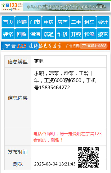 求职,凉菜,炒菜,工龄十年,工资6000到6500,手机号15835464272 【电话咨询时,请一定说明在太原生活网看到的,谢谢!】 |