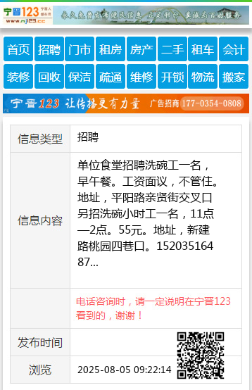 地址,平阳路亲贤街交叉口另招洗碗小时工一名,11点—2点。55元。