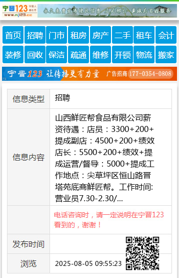 工作地点:尖草坪区恒山路晋塔苑底商鲜匠帮。