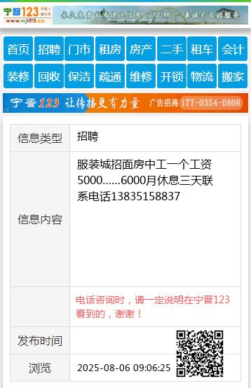服装城招面房中工一个工资5000……6000月休息三天联系电话13835158837