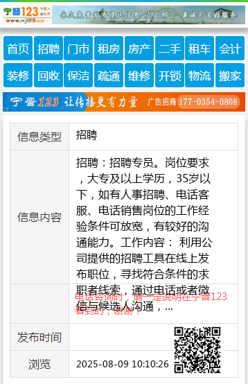 岗位要求,大专及以上学历,35岁以下,如有人事招聘、电话客服、电话销售岗位的工作经验条件可放宽,有较好的沟通能力。