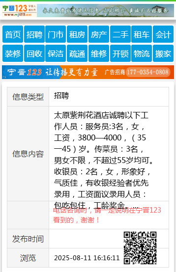 服务员:3名,女,工资,3800—4000,(35一45)岁。