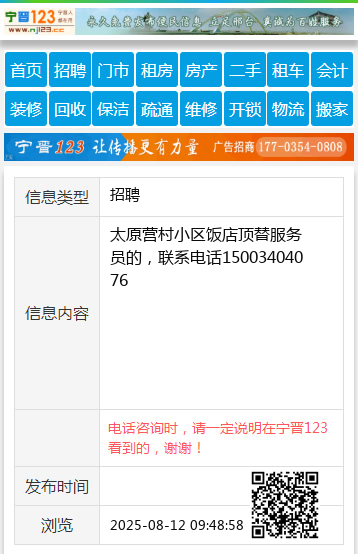太原营村小区饭店顶替服务员的,联系电话15003404076
