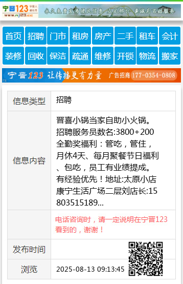 招聘服务员数名:3800+200全勤奖