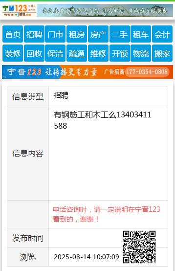 零工 工资:1100-1200 男女不限,年龄55岁以下 工作时间——8.30-12.30(4到5个小时)可以面谈。 联系电话:18342120804微信同步(李女士)