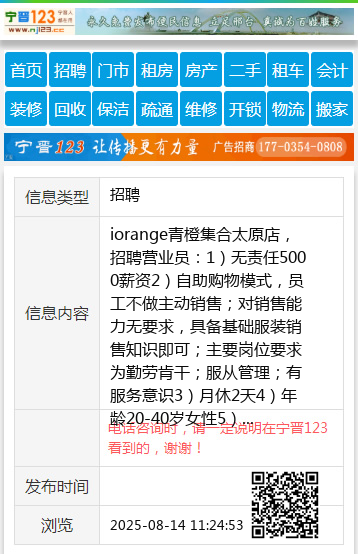 iorange青橙集合太原店,招聘营业员: