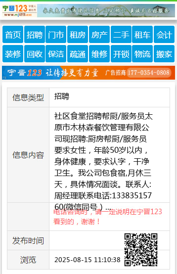 太原市木林森餐饮管理有限公司现招聘:厨房帮厨/服务员