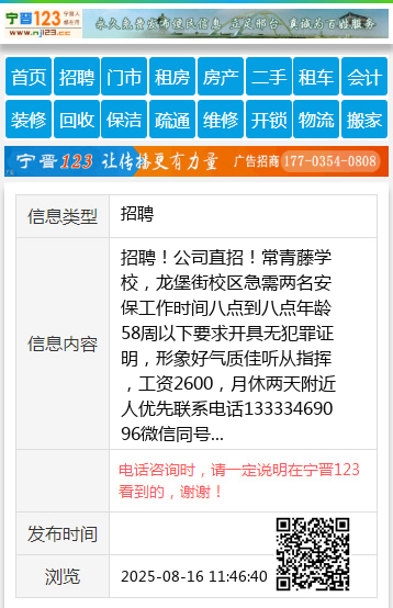 招聘!公司直招!常青藤学校,龙堡街校区急需两名安保工作时间八点到八点