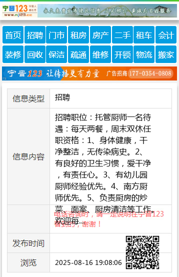 招聘职位:托管厨师一名